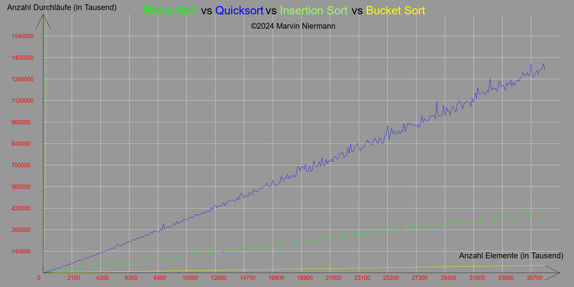 Dieses Programm wurde mit PHP geschrieben. Die Daten basieren alle auf eigenen Ergebnissen und Funktionen, die bis 40.000.000 Elementen im Array sortierten, und dies von 0 an in 10.000er Schritten durchführten. Alle Sortieralgorithmen haben dasselbe Array bekommen.